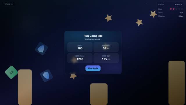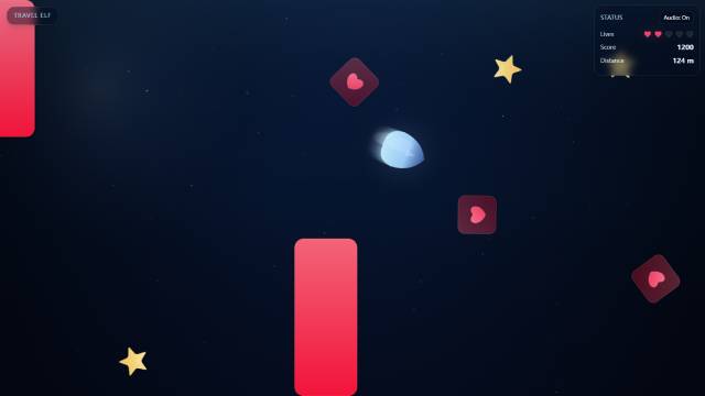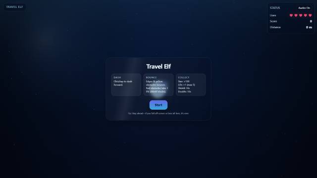 Welcome to Travel Elf, a fantasy adventure game set against the backdrop of a blue night. In this game, you will play as a unique elf. Your goal is to travel as far as possible on this challenging journey, avoiding obstacles while collecting stars and various power-ups.